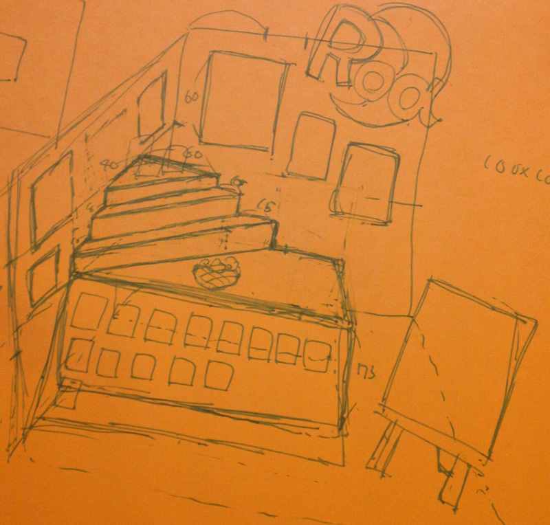 壁の布地取り付けが完成! ということで次は看板設置へ。2つをガムテと釘で1つに。