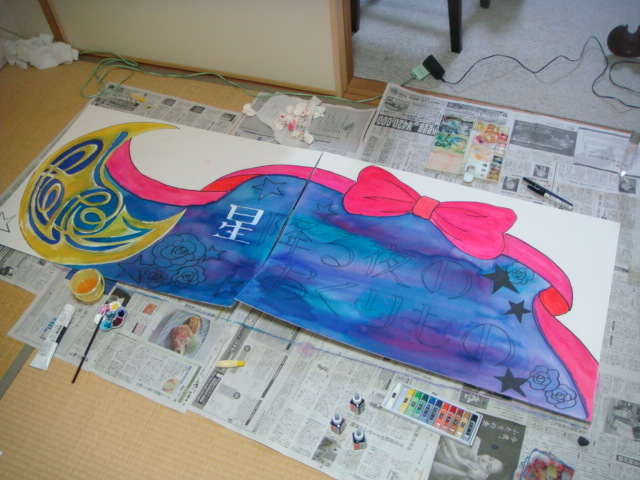 壁の布地取り付けが完成! ということで次は看板設置へ。2つをガムテと釘で1つに。